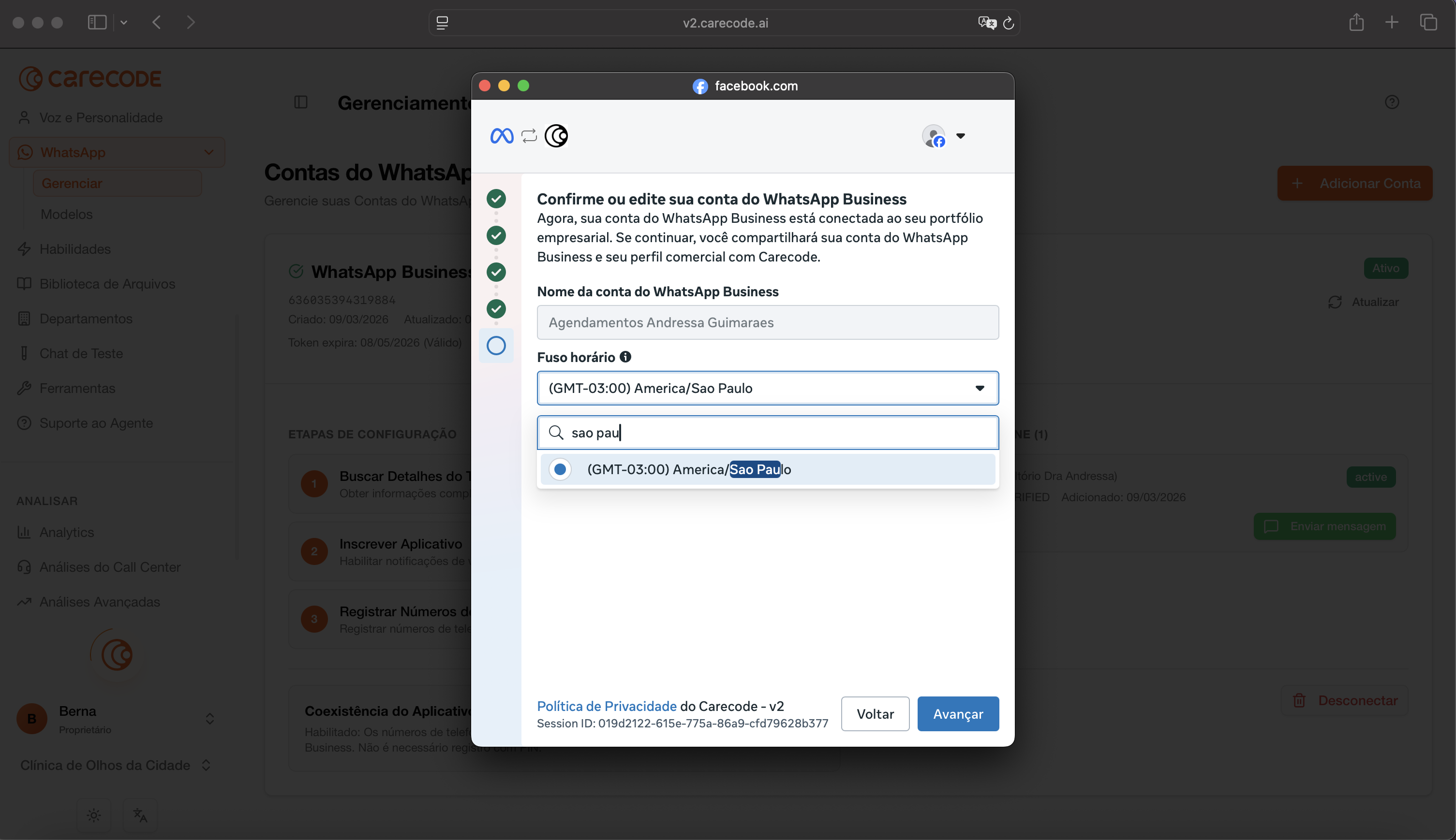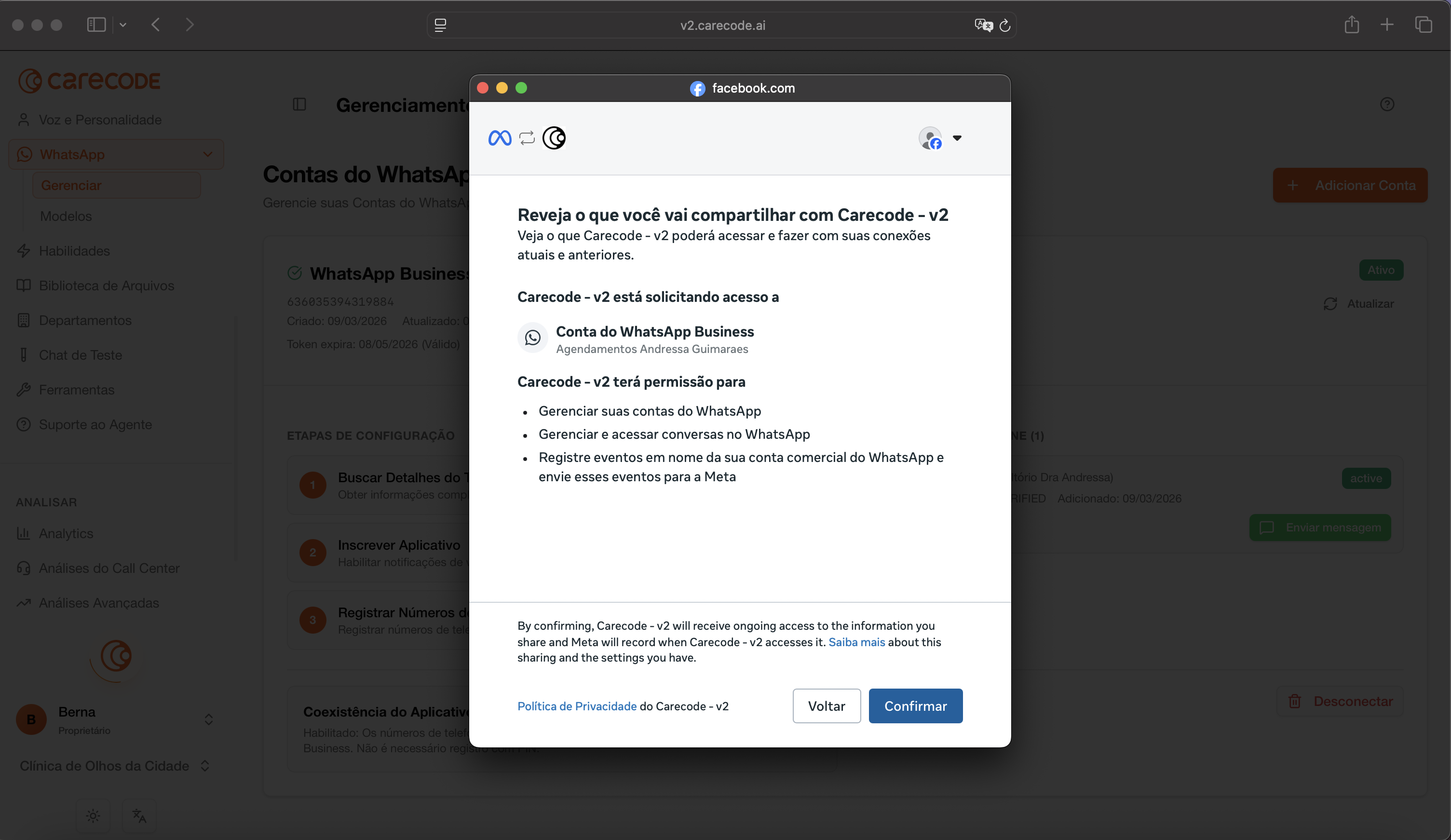 Esta etapa é realizada dentro da plataforma Carecode, em v2.carecode.ai/onboarding/channel (durante o onboarding) ou v2.carecode.ai/whatsapp/manage (se já tiver conta). Ao clicar em conectar WhatsApp, um modal da Meta será aberto.