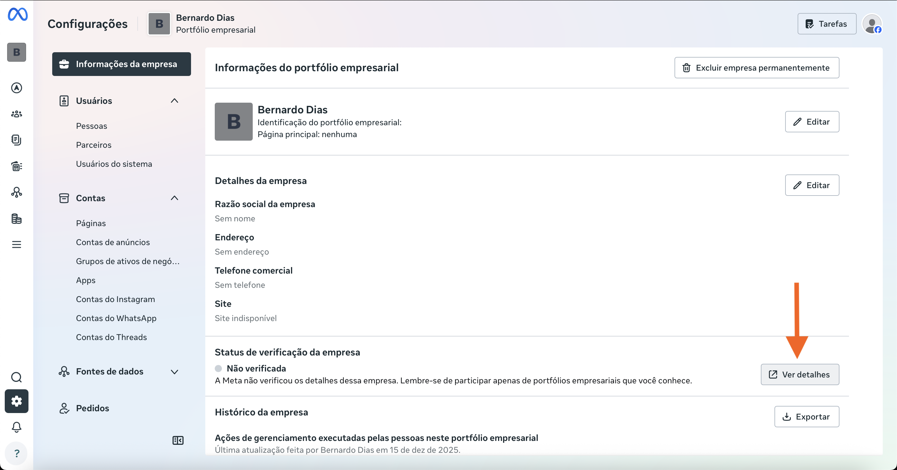 Preencha os dados da empresa em Configurações > Informações da Empresa para que a Meta possa validar seu negócio.