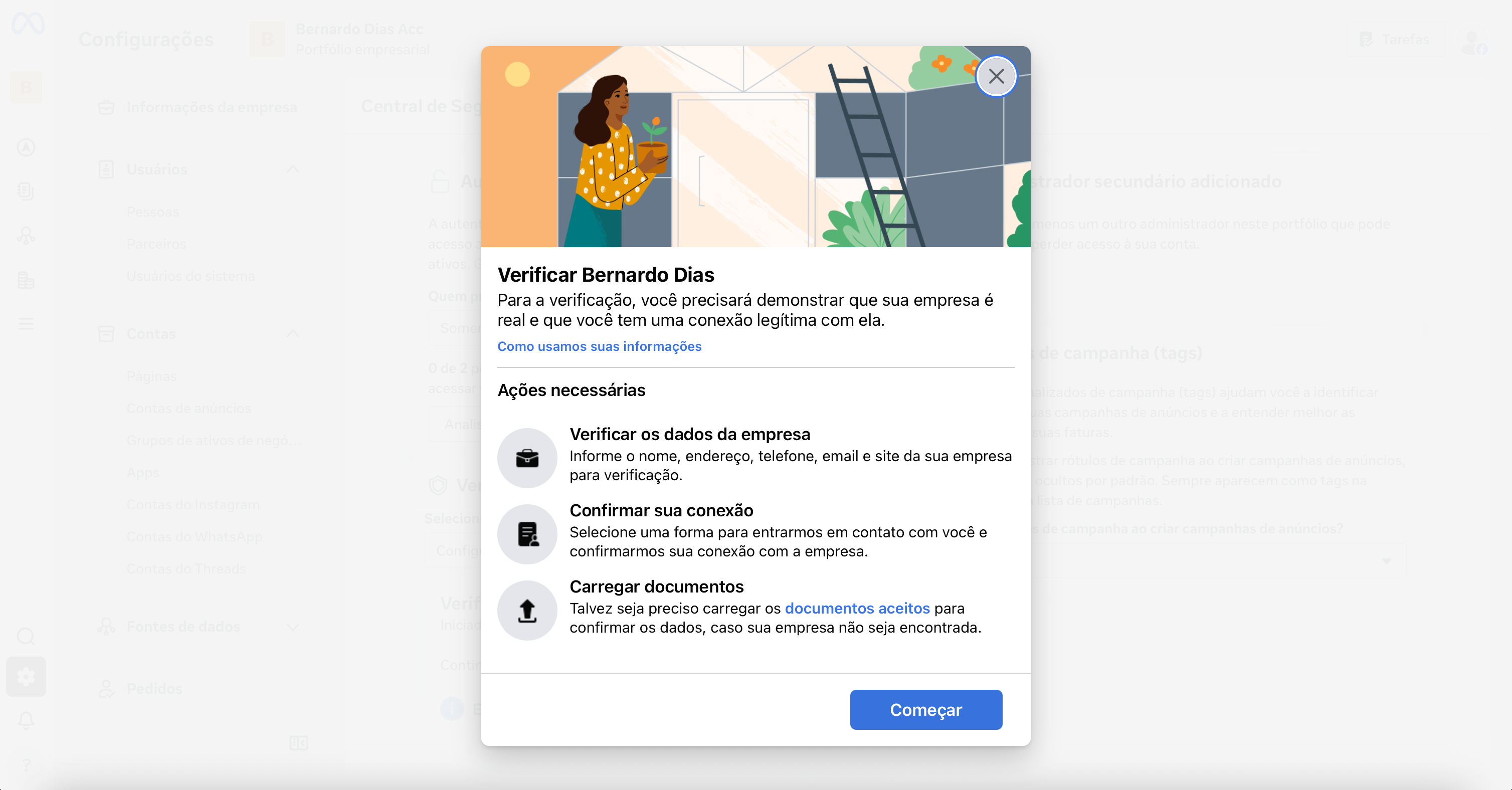 Inicie a verificação da empresa clicando em Ver Detalhes e depois Começar Verificação (ou Continuar) na página aberta.