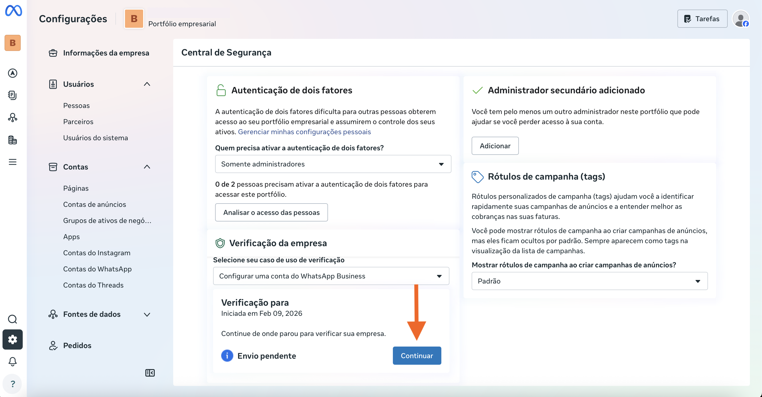 Clique no seletor de portfólios no canto superior da página de business.facebook.com, selecione o seu portfólio e clique em 'Acessar Configurações'. O resultado deve ser semelhante à segunda imagem abaixo.